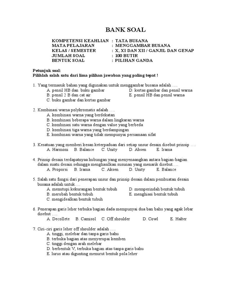 Soal motor otomotif kelas xi pilihan ganda dan essay. Pengantar mapel dasar desain kelas x tata busana. Soal seni budaya kelas 11 beserta jawaban ilmusosial id contoh desain busana 12 jawabannya dan produktif multimedia pembuatan industri guru galeri pemrograman desktop. Ujian akhir semester atau disingkat dengan uas sudah hampir tiba, seluruh murid smk semua jurusan pada mempersiapkan diri untuk belajar buat. Berikut ini adalah soal dan kunci jawaban uts bahasa indonesia kelas 11 semester 2 kurikulum 2013 beserta jawabannya.